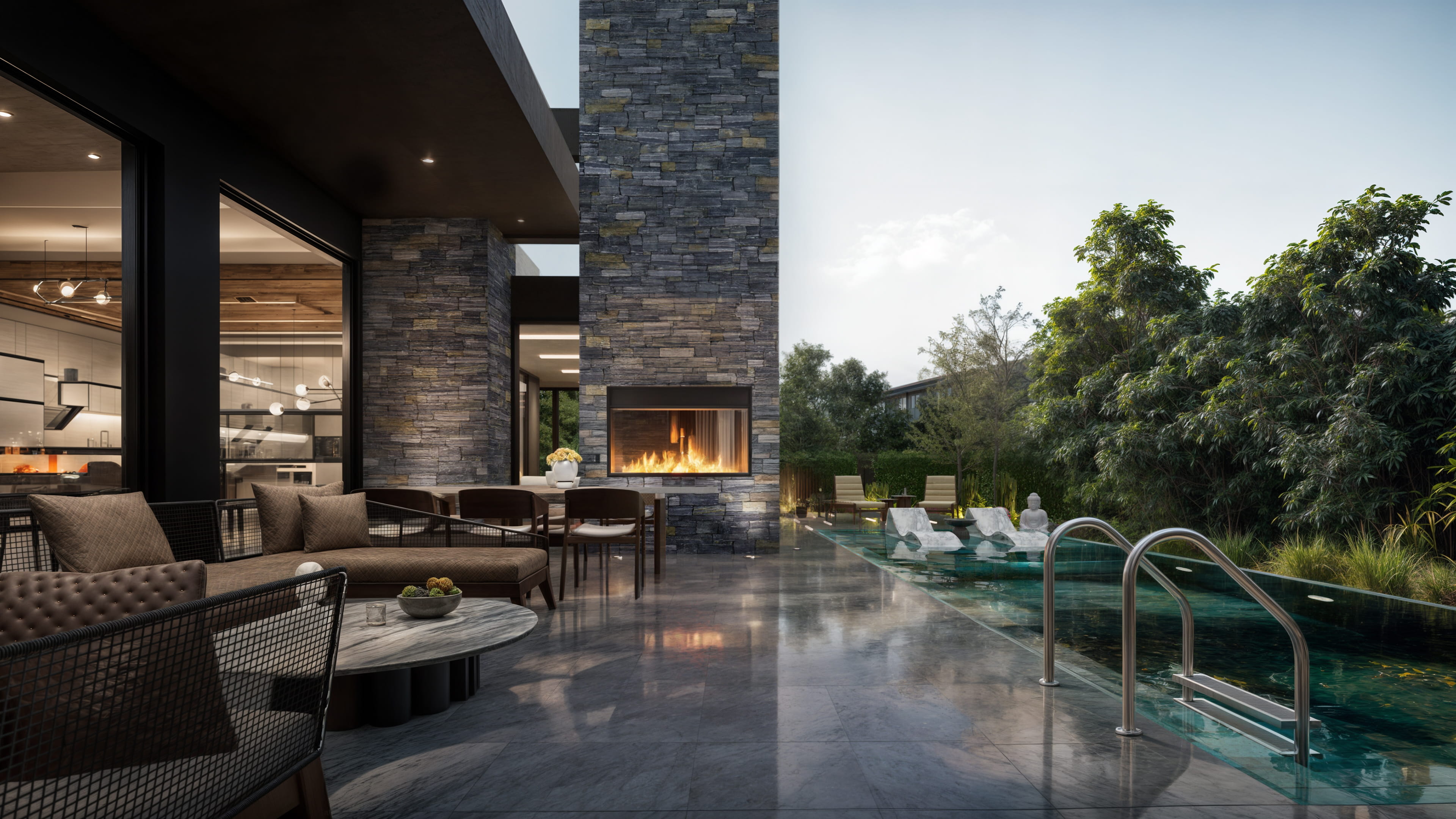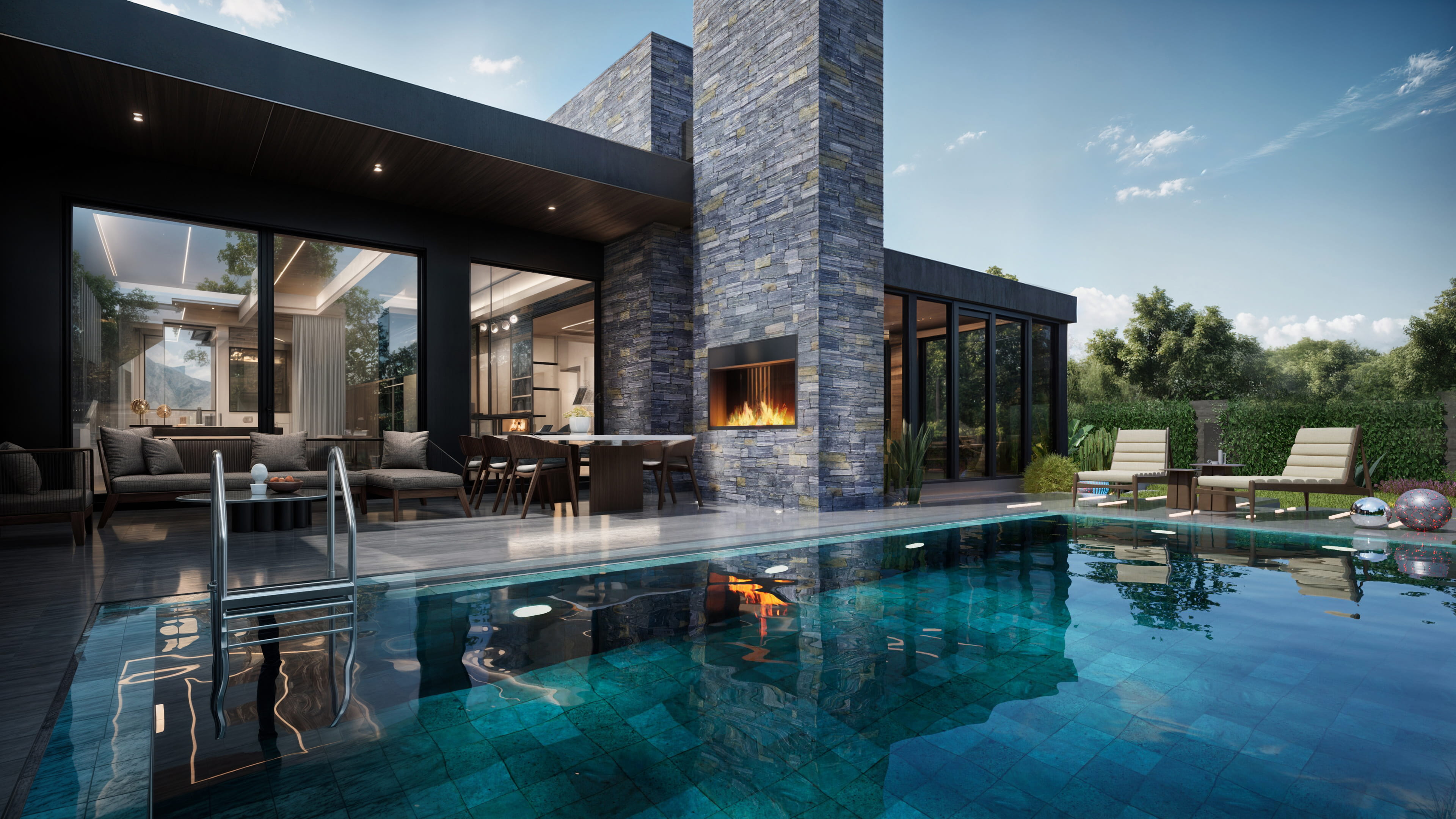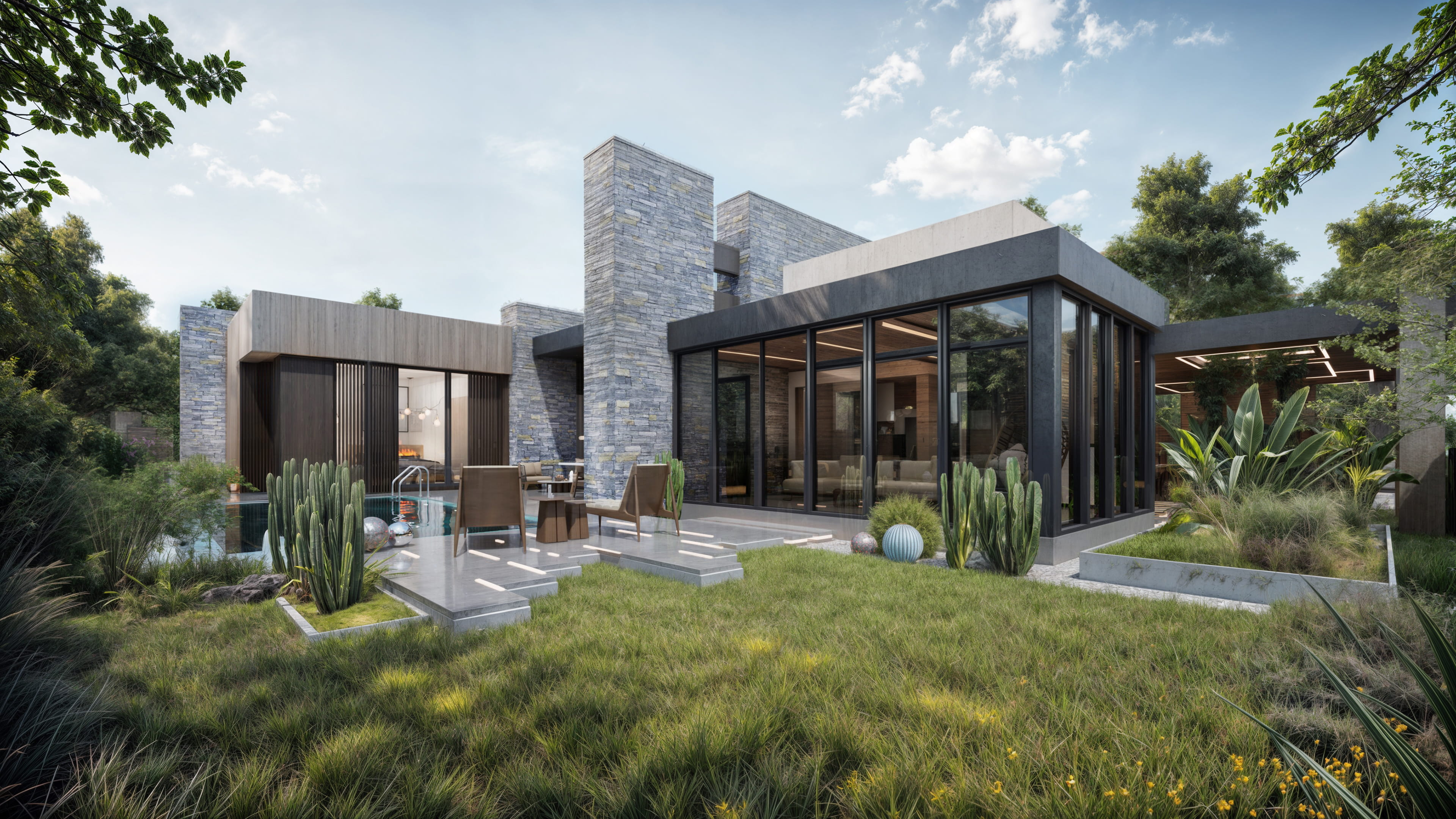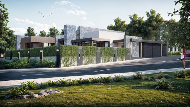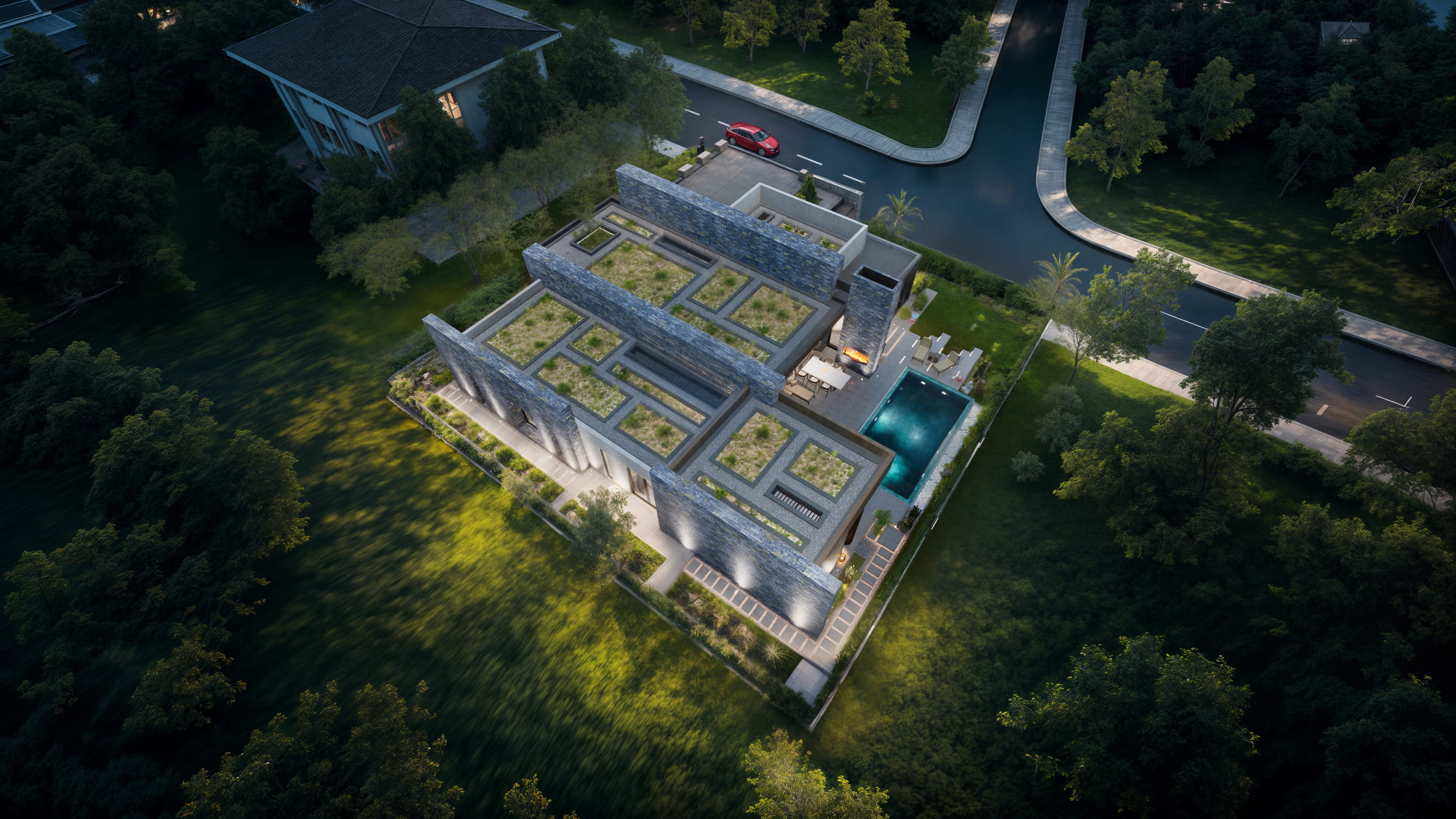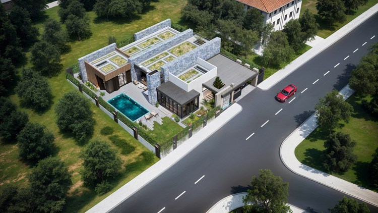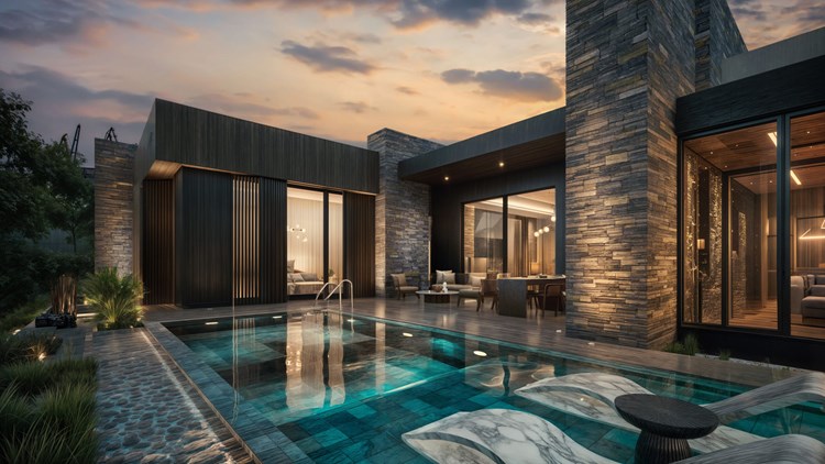 Yapı, tek katlı yatay kütlelerin birleşiminden oluşmakta olup, ana yaşam alanları havuz etrafında konumlandırılmıştır. Bu kurgu, kullanıcıların tüm yaşam senaryosunu dış mekanla entegre bir biçimde deneyimlemesine olanak tanımaktadır. Geniş açıklıklı cam yüzeyler ve sürme doğramalar sayesinde iç mekânlar, teras ve havuz alanlarıyla doğrudan ilişki kurarken, mekansal derinlik ve ferahlık artırılmıştır.Fonksiyonel olarak salon, mutfak ve yemek alanı gibi ortak kullanım mekânları havuza yönlendirilmiştir. Açık ve yarı açık mekânlar (teraslar, oturma alanları, pergolalar) yaşam alanlarının doğal bir uzantısı olarak tasarlanmıştır.