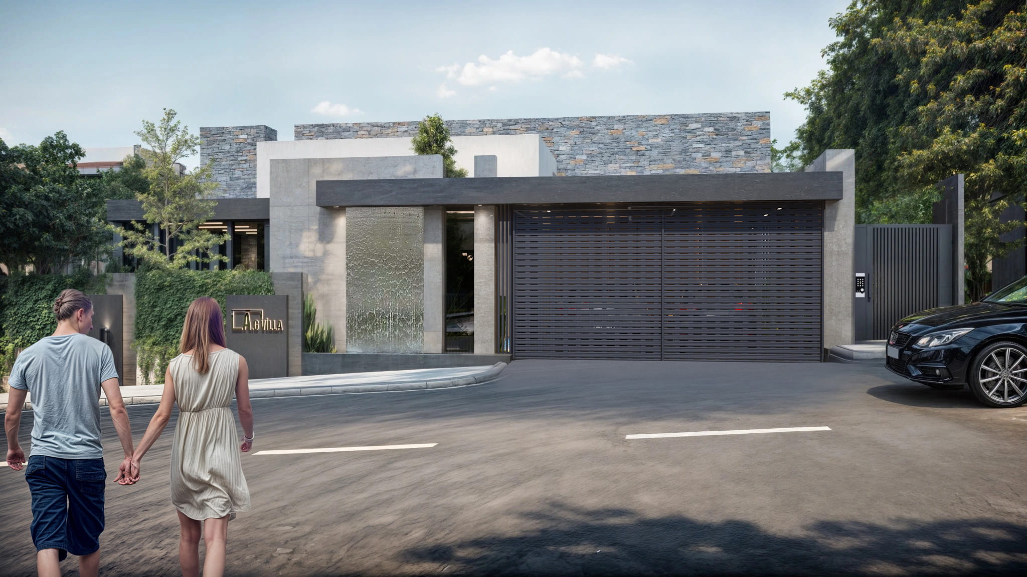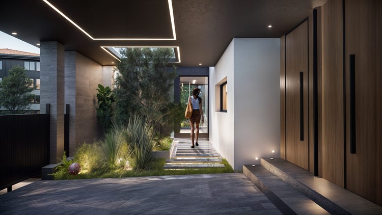 Peyzaj tasarımı, mimari ile bütünleşik olarak ele alınmış; sert zeminler, su öğesi ve bitkisel düzenlemeler dengeli bir kompozisyon içinde çözülmüştür. Havuz, yalnızca rekreatif bir unsur değil, aynı zamanda mekansal organizasyonun merkezinde yer alan bir tasarım elemanı olarak değerlendirilmiştir. Bahçe duvarları, yeşil sınırlar ve kontrollü giriş kurgusu sağlanmıştır.