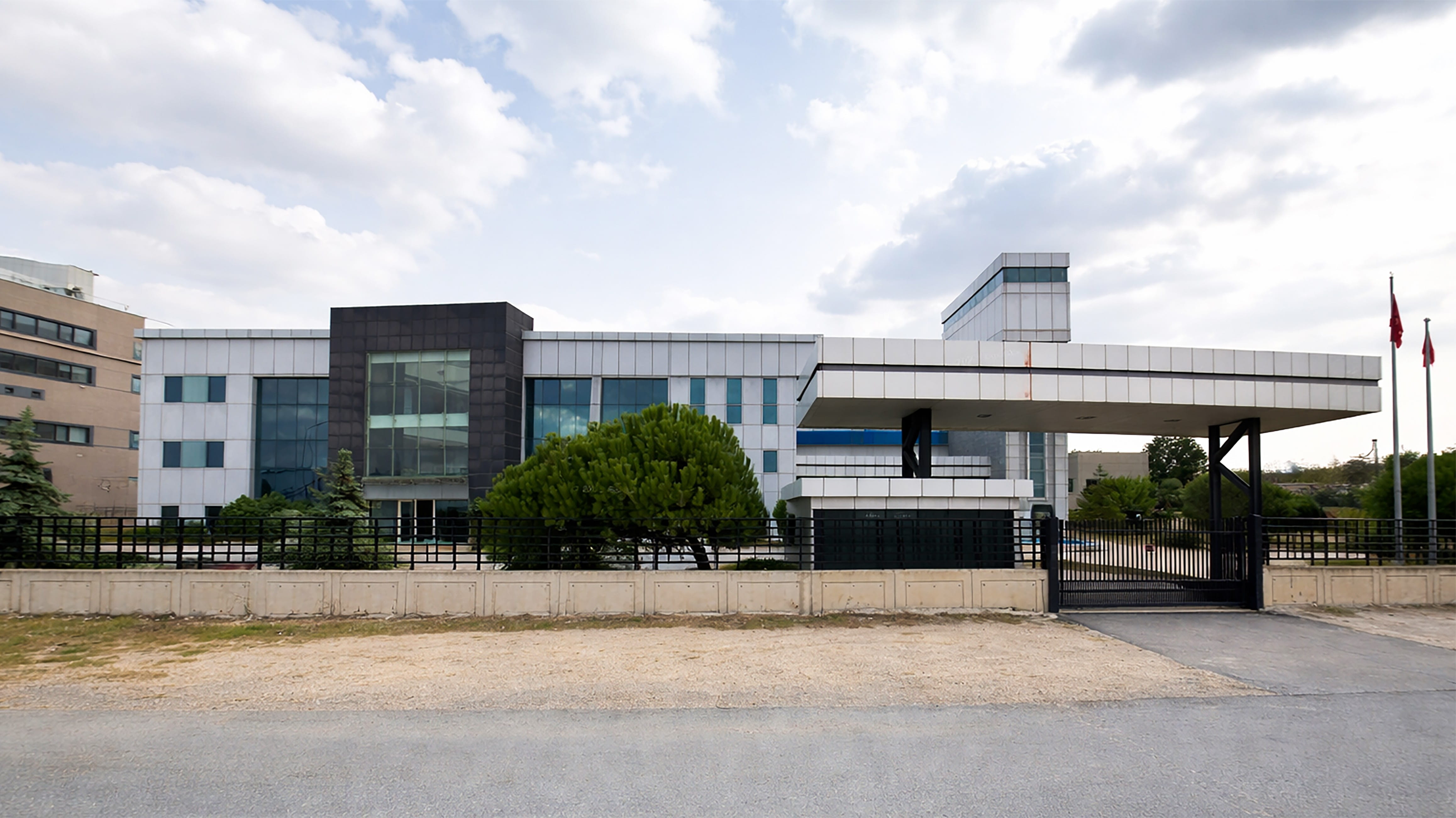 Yerleşim kararlarında yapı, parsel içerisinde geri çekilerek konumlandırılmış ve önünde geniş bir yaklaşım ve manevra alanı bırakılmıştır. Bu alan, hem araç sirkülasyonunu rahatlatmakta hem de yapı ile yol arasında kontrollü bir geçiş oluşturmaktadır. Ana giriş, güvenlik birimi ve kontrollü kapı sistemi ile tanımlanmış; personel ve ziyaretçi girişleri ile servis girişleri birbirinden ayrıştırılmıştır.