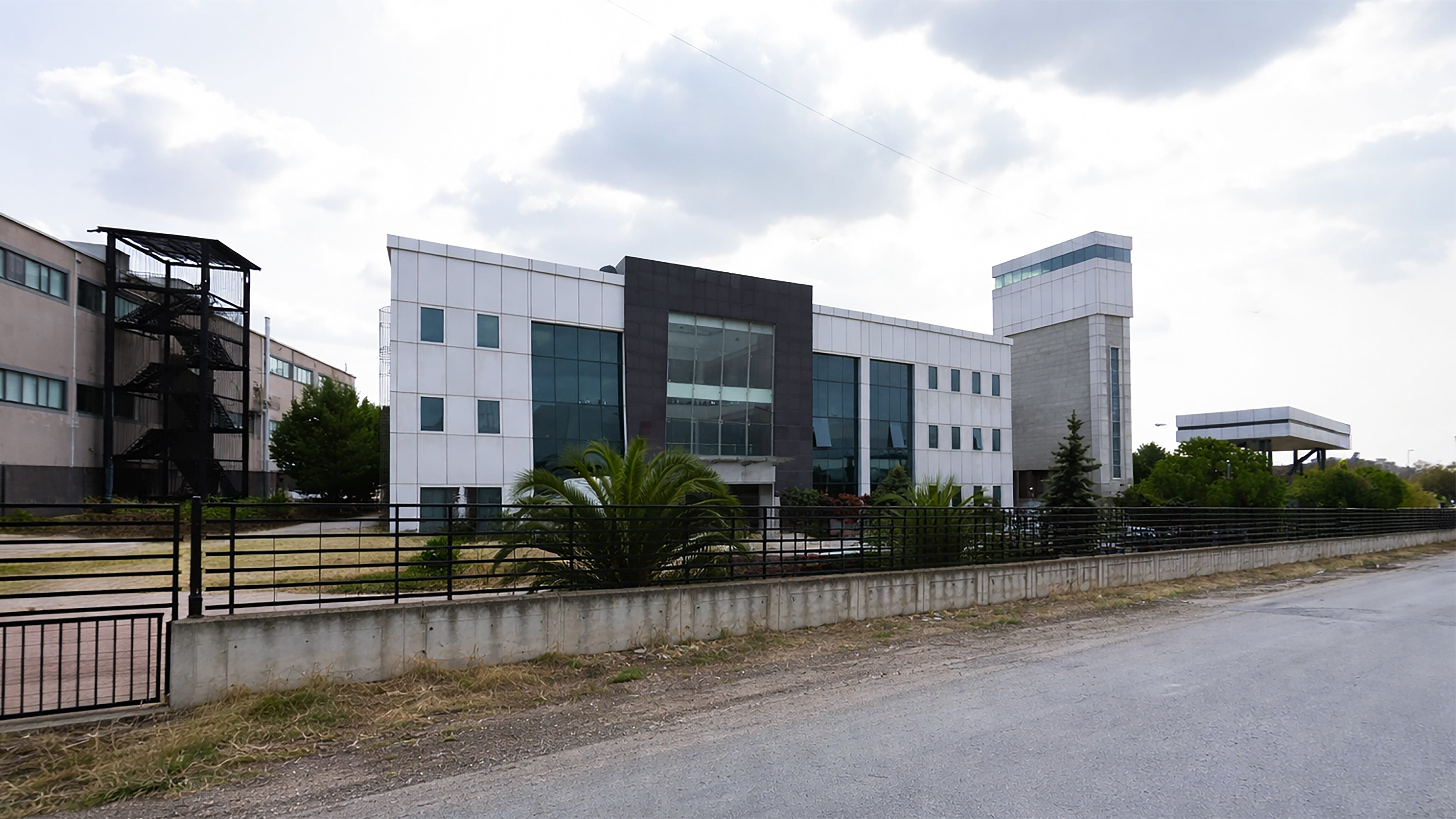 Cephe tasarımında modüler panel sistemleri, geniş cam yüzeyler ve sade renk paleti tercih edilmiştir. Açık tonlu kaplama panelleri, yapının endüstriyel karakterini vurgularken;kullanılan cam yüzeyler şeffaflık ve kurumsallık algısını güçlendirmektedir. Kule elemanında kullanılan düşey pencere bantları, yapı yüksekliğini daha da vurgulayan bir etki yaratmaktadır.