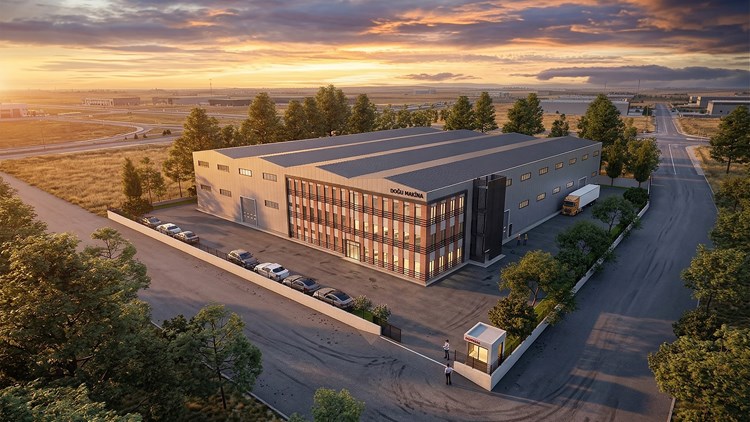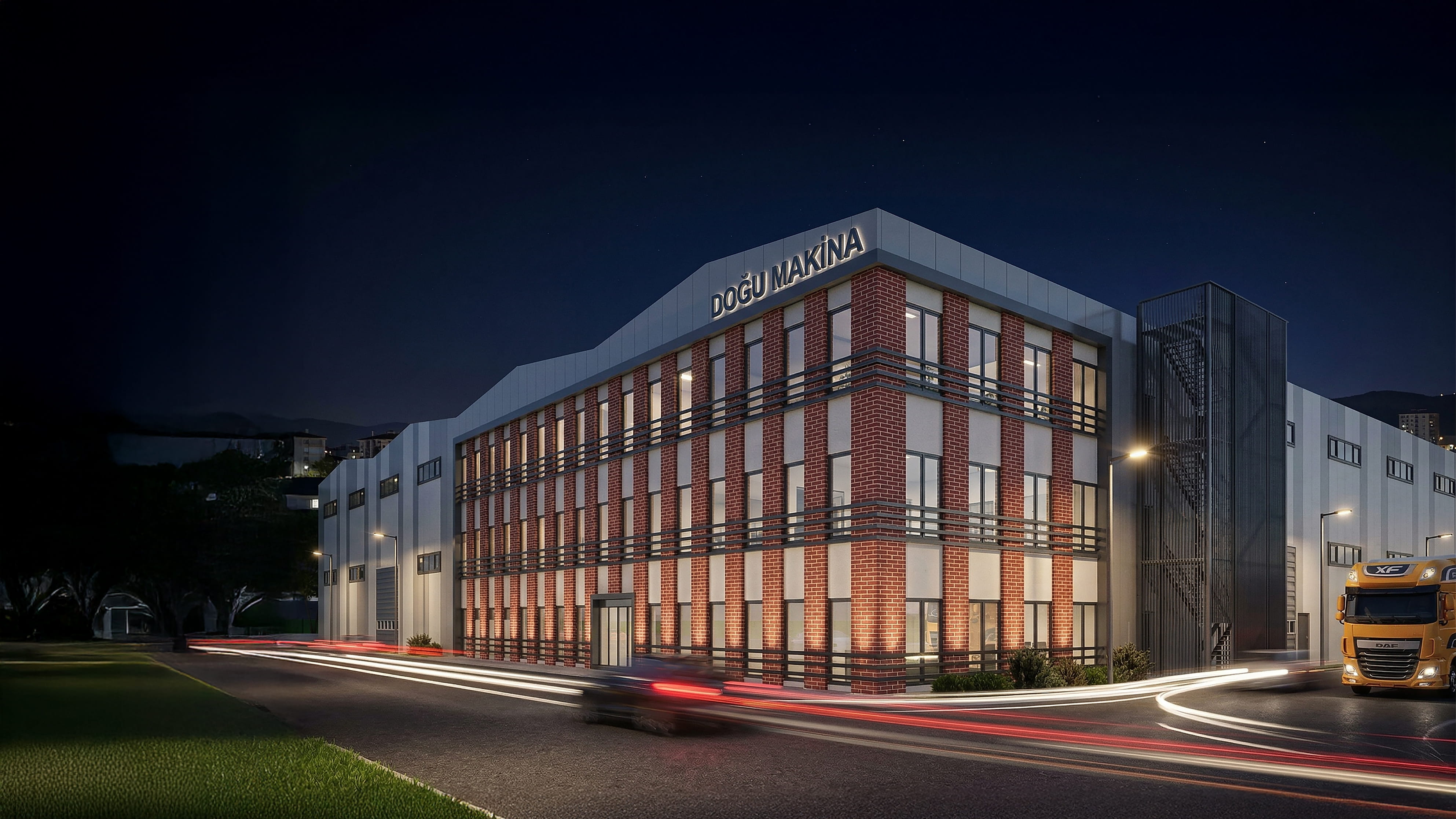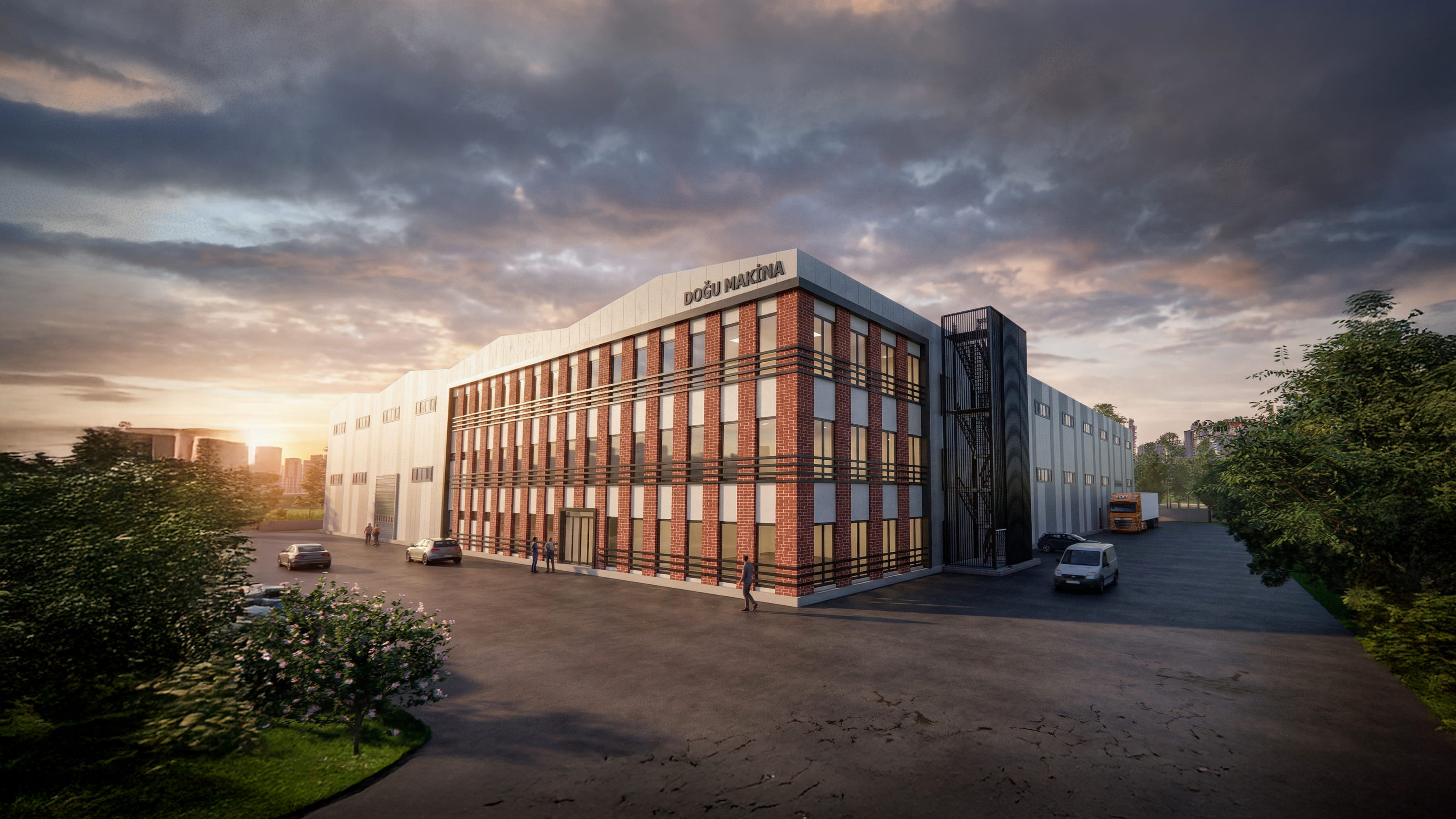 İstanbul Silivri'de bulunan Doğu Makina üretim ve lojistik tesisi, geniş bir parsel üzerinde konumlanarak üretim, depolama ve idari birimleri tek bir bütün içerisinde çözümlemektedir.Ana yapı kütlesi, arka planda yer alan geniş açıklıklı ve yüksek hacimli üretim/depo alanı ile ön cephede konumlanan çok katlı idari bloktan oluşmakta, bu iki farklı fonksiyon cephe dili ve kütle etkisi ile okunabilir biçimde ayrıştırılmaktadır.