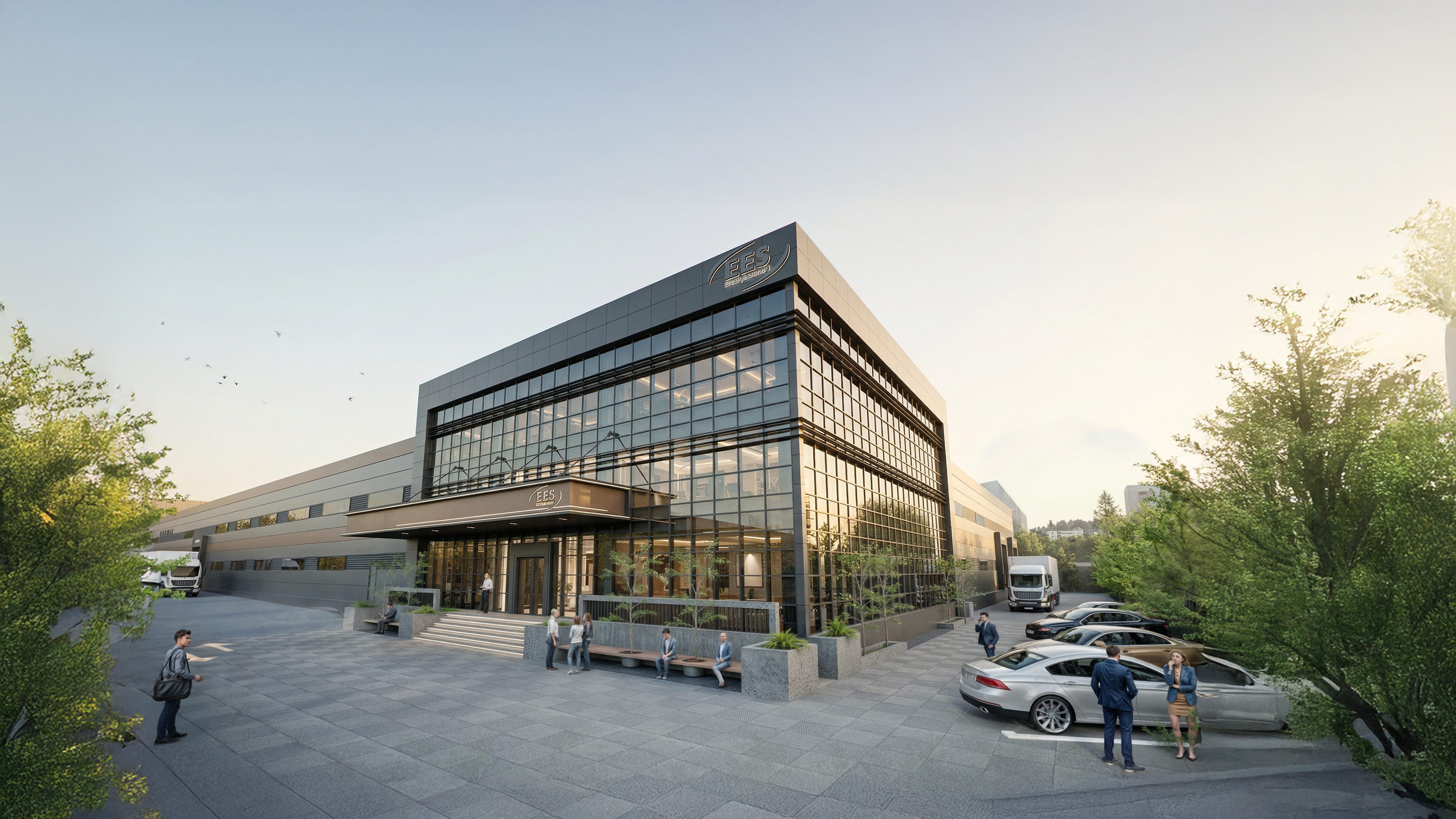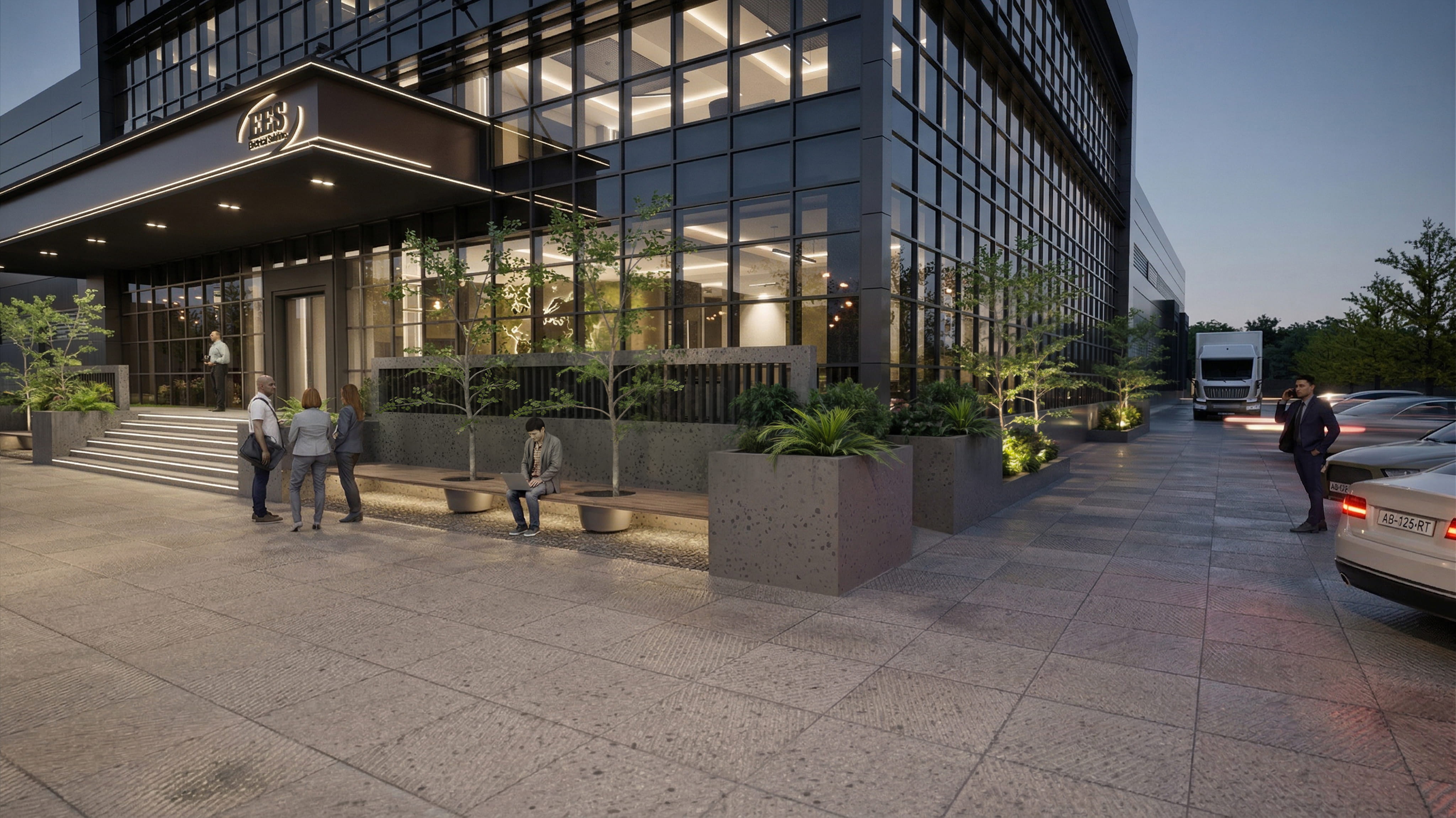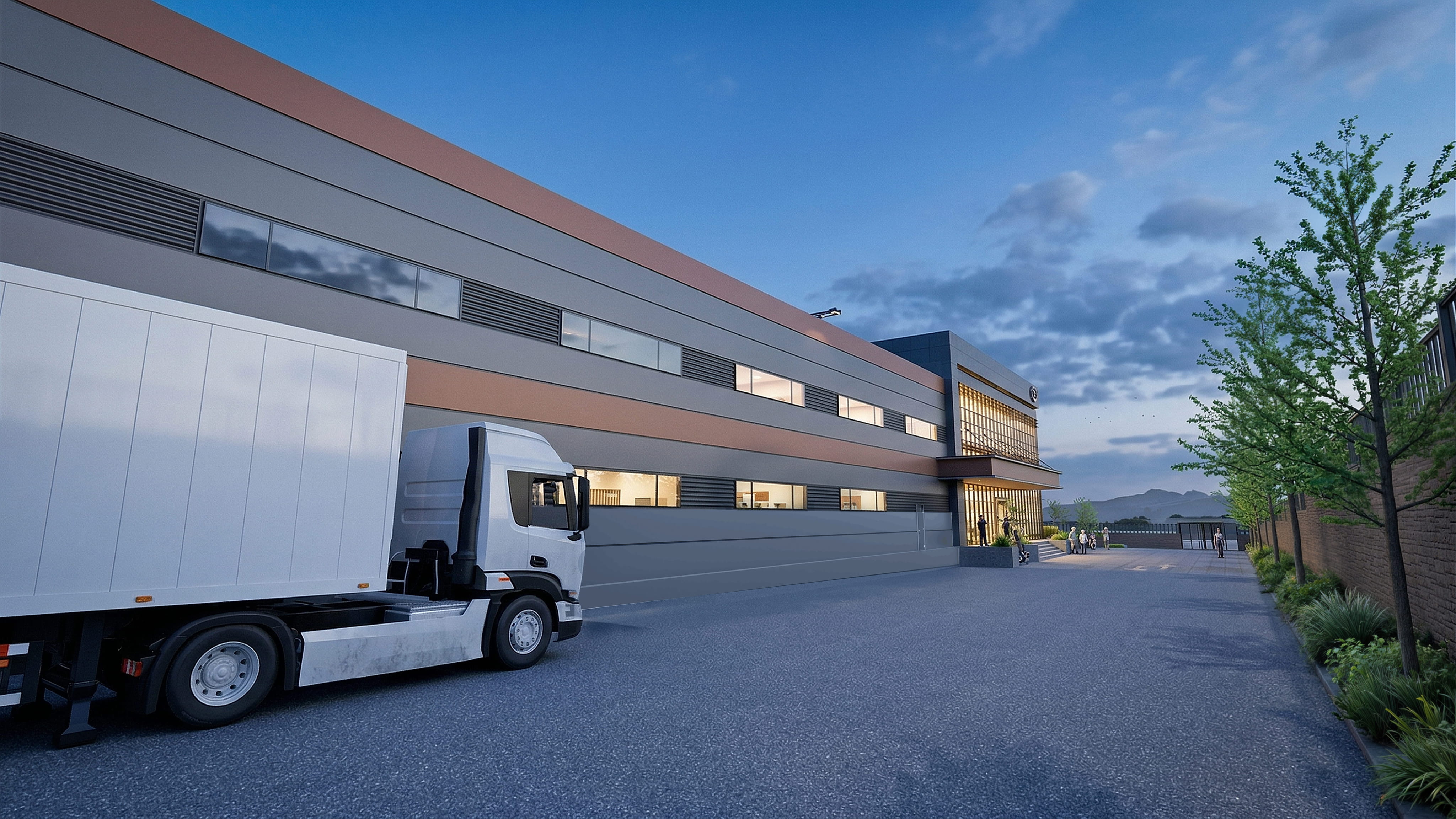 Yapı kütlesi, geniş açıklık gerektiren üretim alanları ile daha kontrollü ölçekli idari birimlerin birleşiminden oluşan bütüncül bir kompozisyon olarak kurgulanmıştır. Üretim hacmi tek katlı ve prefabrik taşıyıcı ile çözülerek esnek kullanım imkânı sağlarken, ön cephede konumlanan üç katlı idari blok, yapıya kurumsal bir yüz kazandırmaktadır. Bu blok, şeffaf cephe dili ve geri çekilen giriş saçağı ile vurgulanmış, kullanıcıyı karşılayan yarı açık bir mekân oluşturulmuştur.