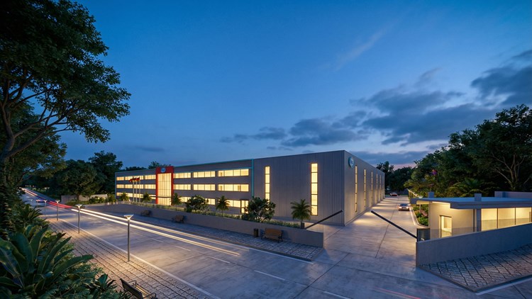 İdari birim, yapının ön cephesinde vurgulanarak konumlandırılmış ve kurumsal kimliği yansıtan bir cephe dili ile tasarlanmıştır. Orta aksda yer alan düşey cam yüzey, giriş vurgusunu güçlendirirken yapıya simetrik ve dengeli bir görünüm kazandırmaktadır. Cephede kullanılan kırmızı renkli çerçeve elemanları, yapı kütlesini tanımlayan ve marka kimliğini öne çıkaran güçlü bir tasarım girdisi olarak öne çıkmaktadır. Gri tonlu sandviç panel kaplamalar ise endüstriyel karakteri destekleyen, dayanıklı ve ekonomik bir çözüm sunmaktadır.
