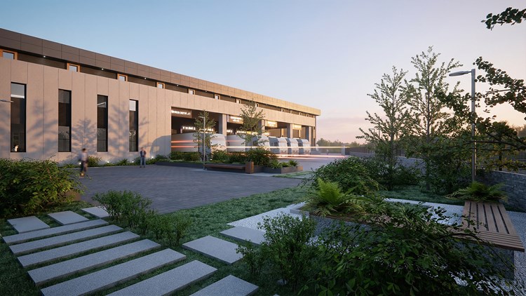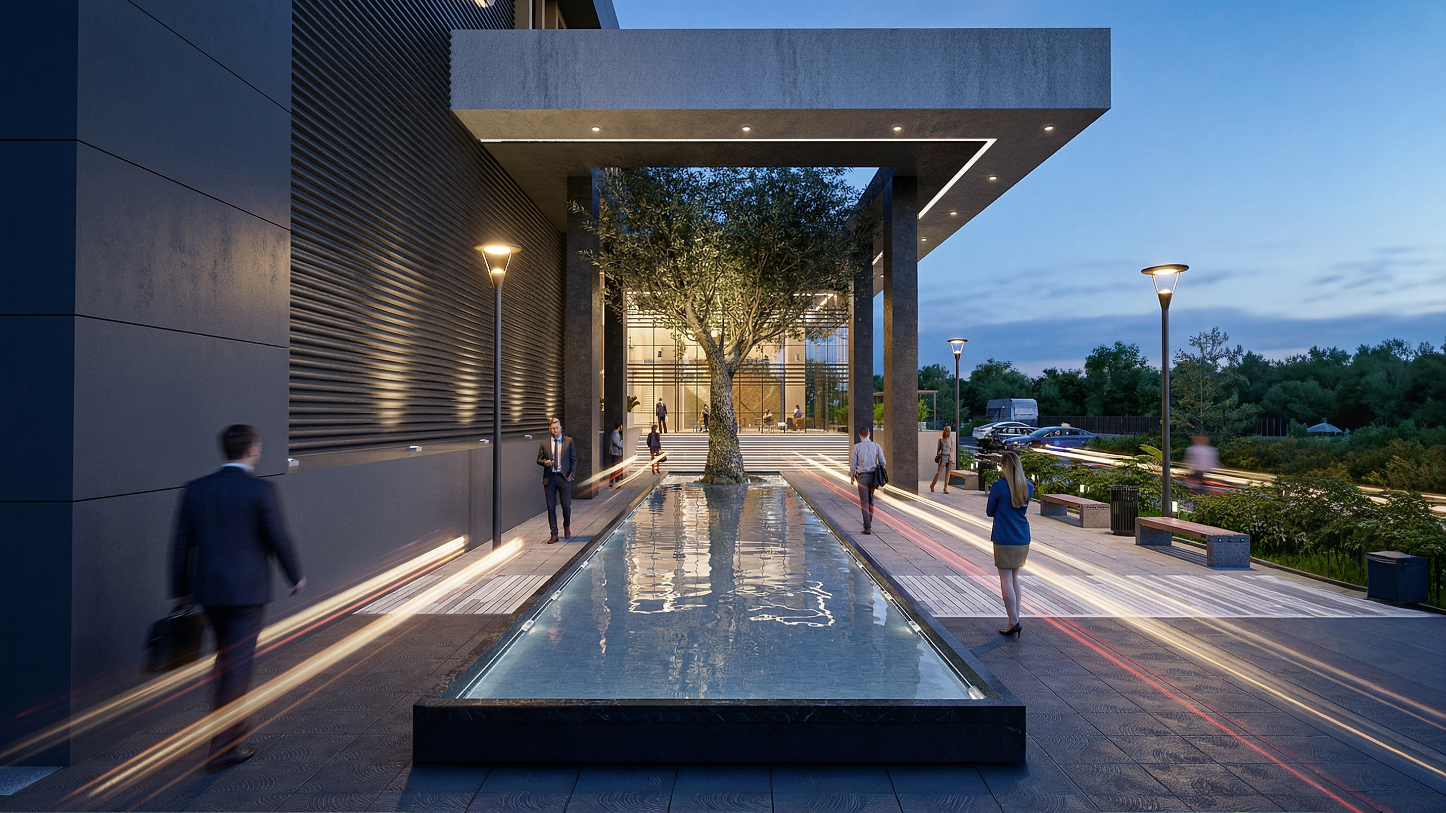 Peyzaj tasarımında giriş aksı boyunca oluşturulan yeşil bantlar, su öğeleri ve ağaçlandırma çalışmaları ile endüstriyel yapının sert etkisi yumuşatılmış, otopark alanları ve yaya yolları gölgeleme elemanları ile desteklenerek kullanıcı deneyimi artırılmış, sert zemin ve yeşil alan dengesi korunmuştur.