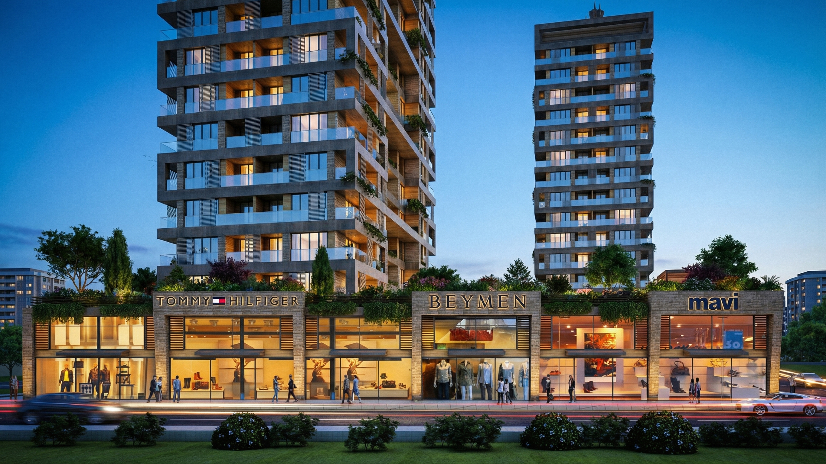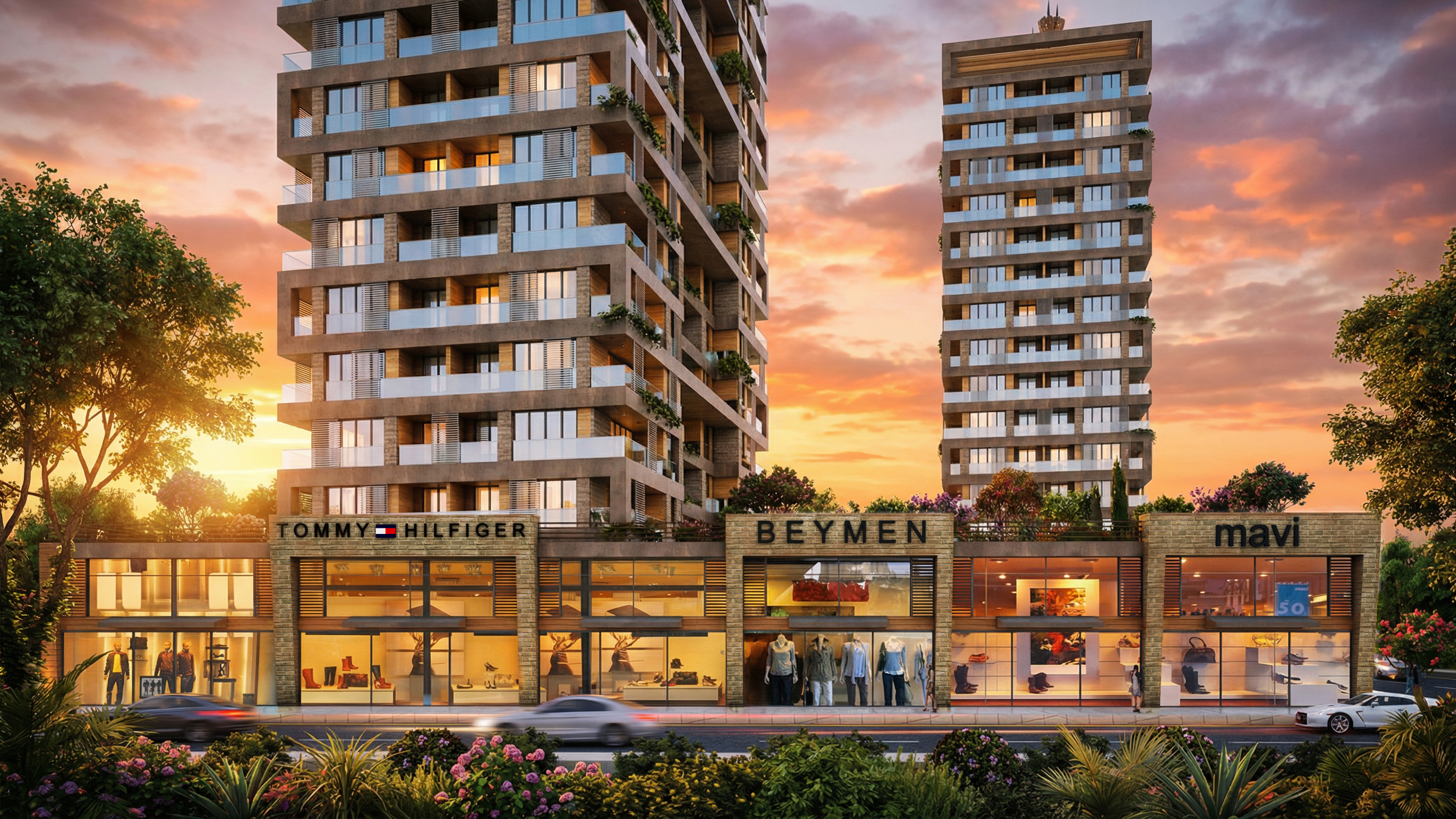Zemin kotunda süreklilik arz eden ticari birimler, cadde boyunca kesintisiz bir vitrin etkisi oluşturarak kentsel yaşama doğrudan katkı sağlamaktadır. Geniş cam cepheler sayesinde iç-dış mekân ilişkisi güçlendirilmiş, markalaşmış mağaza kullanımları ile yapının ticari değeri artırılmıştır. Üst kotta yer alan konut blokları ise bu ticari platform üzerinden yükselerek hem gürültüden izole edilmiş hem de daha kontrollü bir yaşam alanı sunacak şekilde çözülmüştür. Yapı girişleri, ticari akıştan ayrıştırılarak net ve okunabilir bir biçimde tanımlanmıştır.