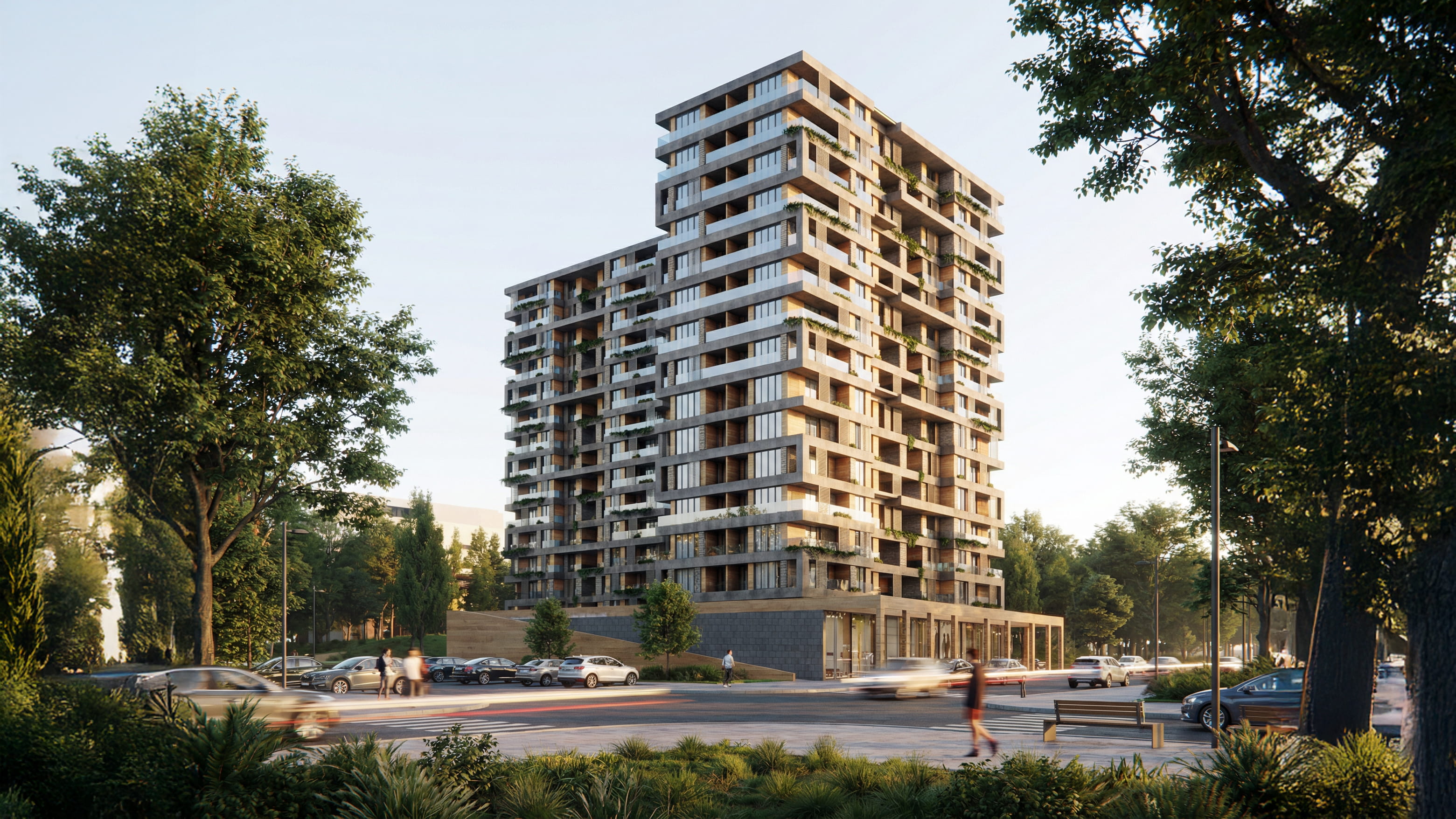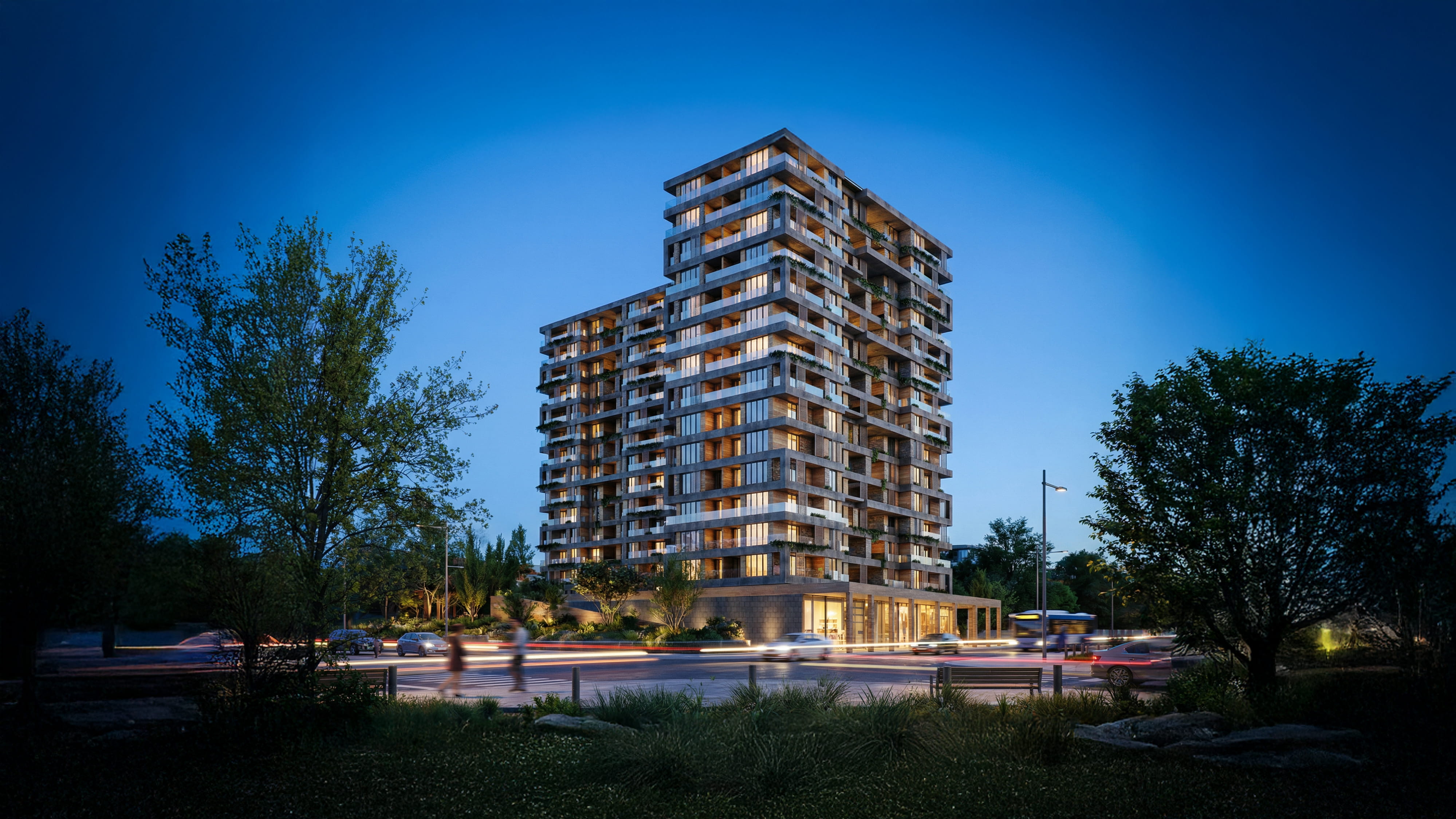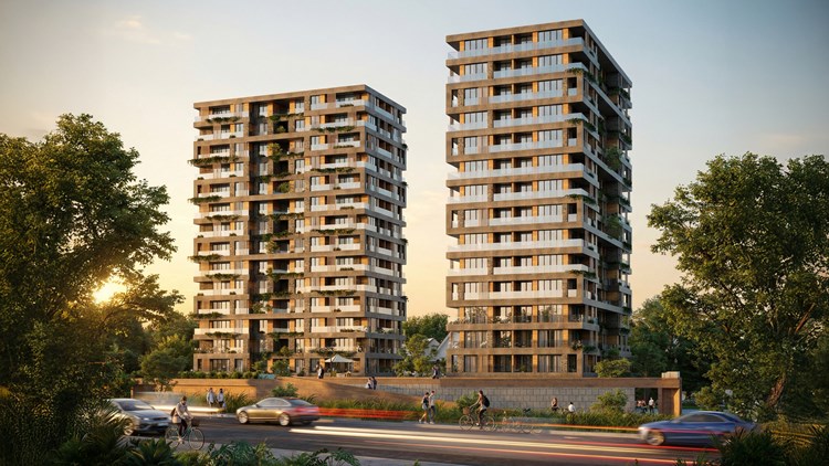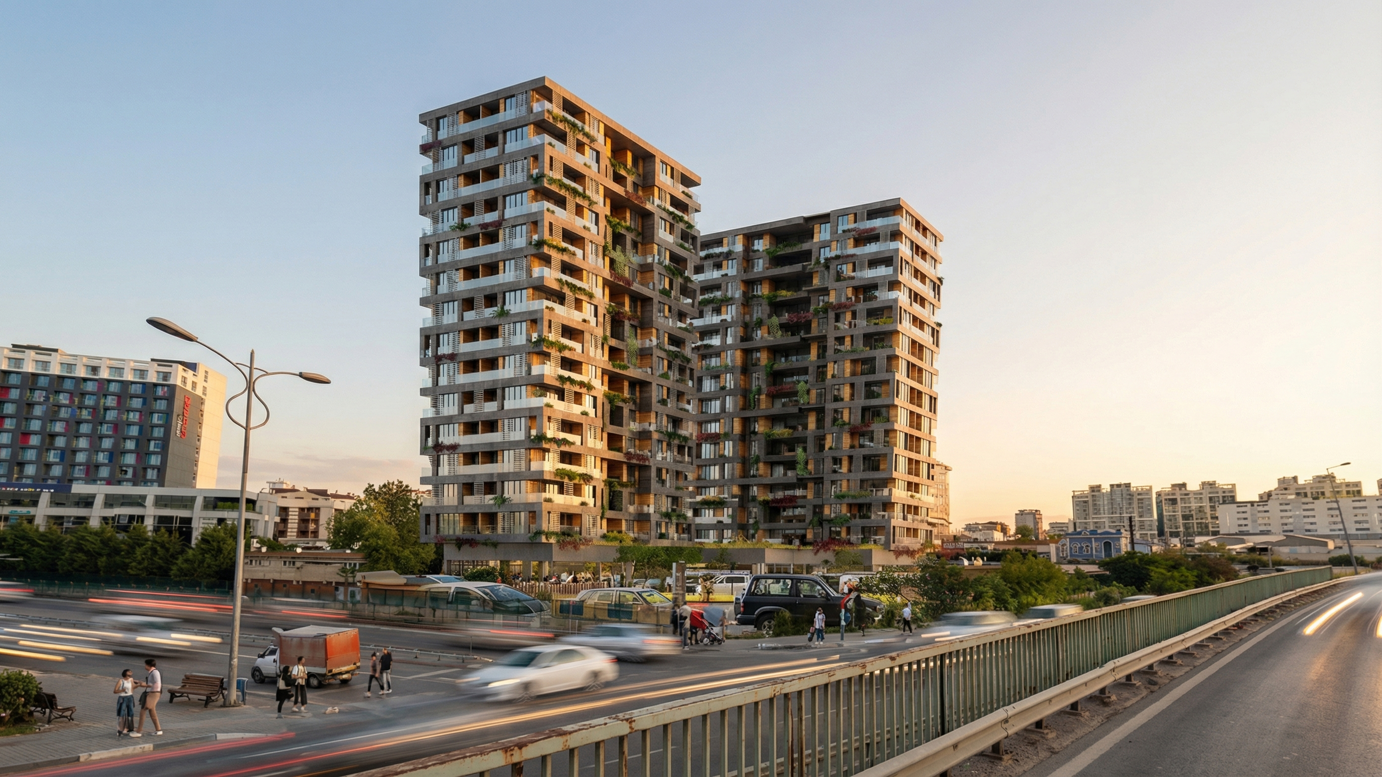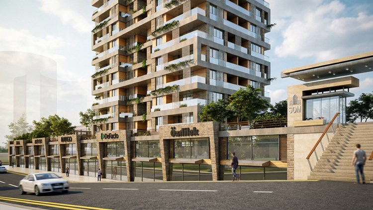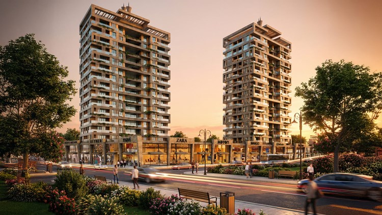 Cephe tasarımında, yeşil saksı alanları ve geniş teraslar öne çıkarılarak, yapıda yaşayan ve çalışan bireylerin yaşam konforunu artırmak amaçlanmıştır. Bu yaklaşımla, yeşil alanların entegrasyonu sayesinde doğayla iç içe bir yaşam deneyimi sunulurken, geniş teraslar ve cephe elemanları aracılığıyla yapıların estetik değeri de artırılmıştır. Proje, hem konut hem de ticari birimlerin ihtiyaçlarını karşılayan, dengeli ve kullanıcı odaklı bir tasarım anlayışıyla şekillendirilmiştir. Bu proje, kentsel ölçekte güçlü bir referans noktası oluşturmayı hedefleyen, iki adet yüksek katlı konut bloğu ile zemin kotunda süreklilik gösteren ticari birimlerden oluşan karma kullanımlı bir yapı kompleksi olarak tasarlanmıştır. Yapı kütleleri, geniş bir cadde aksı boyunca konumlandırılarak hem şehir siluetine katılan bir dikey vurgu oluşturmakta hem de alt kotta tanımlanan ticari bant ile kamusal hayatı besleyen aktif bir cephe üretmektedir. Blokların birbirine göre konumlanışı, hem manzara yönlenmesi hem de gün ışığı ve rüzgâr sirkülasyonu dikkate alınarak kurgulanmış, böylece kullanıcı konforu üst seviyeye taşınmıştır.