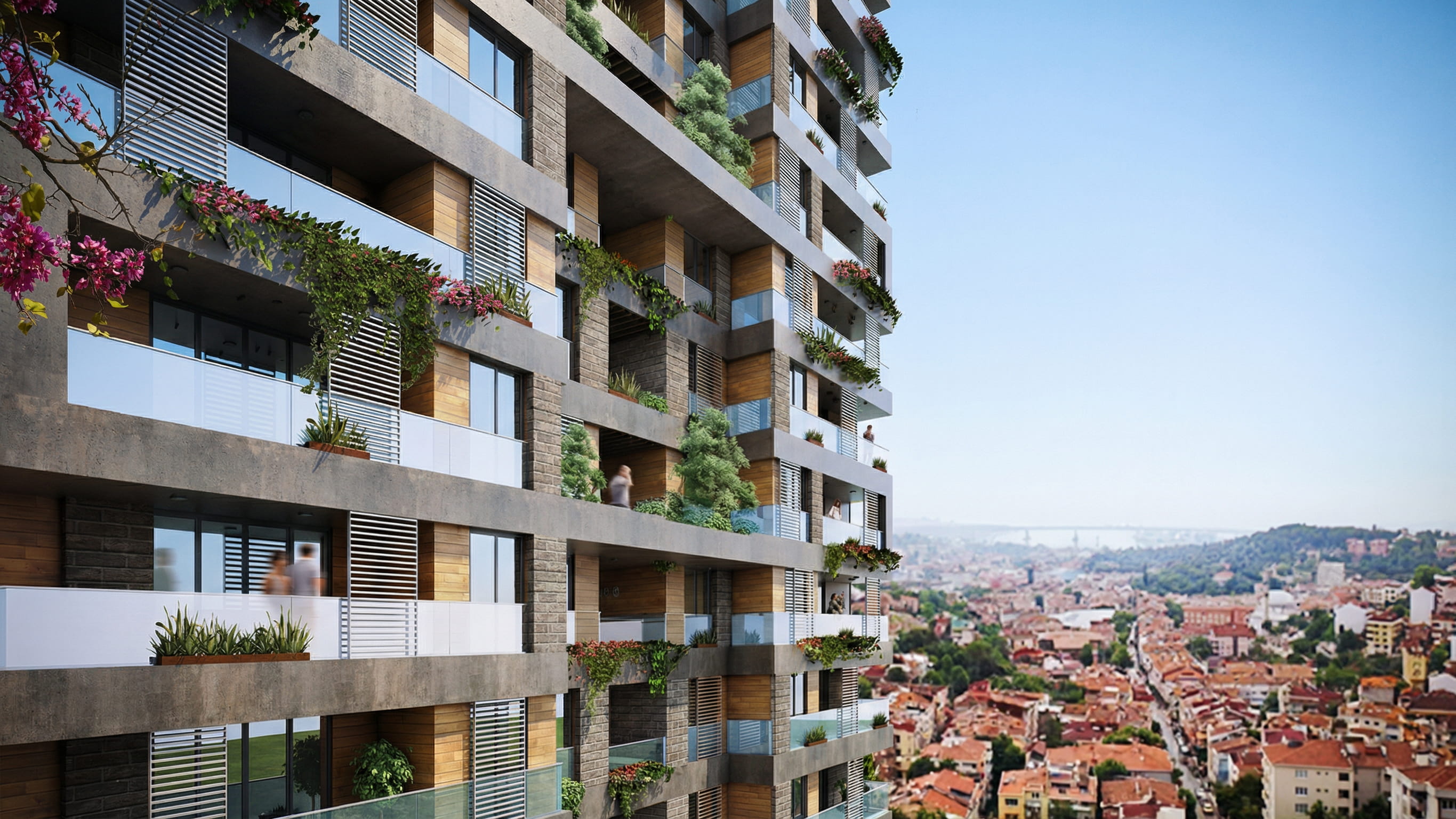 Mimari dil, yatay bantların güçlü şekilde vurgulandığı ve katlar arası sürekliliğin ön plana çıkarıldığı bir cephe organizasyonu üzerine kuruludur. Betonarme kütle etkisini yumuşatmak amacıyla doğal taş dokusu, ahşap görünümlü kaplamalar ve geniş cam yüzeyler birlikte kullanılmış, bu sayede hem modern hem de sıcak bir cephe karakteri elde edilmiştir. Balkonlar, yalnızca çıkma elemanları olarak değil, aynı zamanda cepheyi katmanlandıran ve yeşil doku ile zenginleştiren yaşam alanları olarak ele alınmıştır. Bitkilendirilmiş balkonlar ve teraslar, yapının ekolojik değerini artırırken, kullanıcıya doğa ile temas kurma imkânı sunmaktadır.