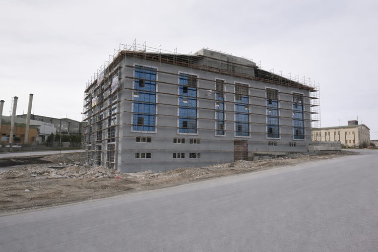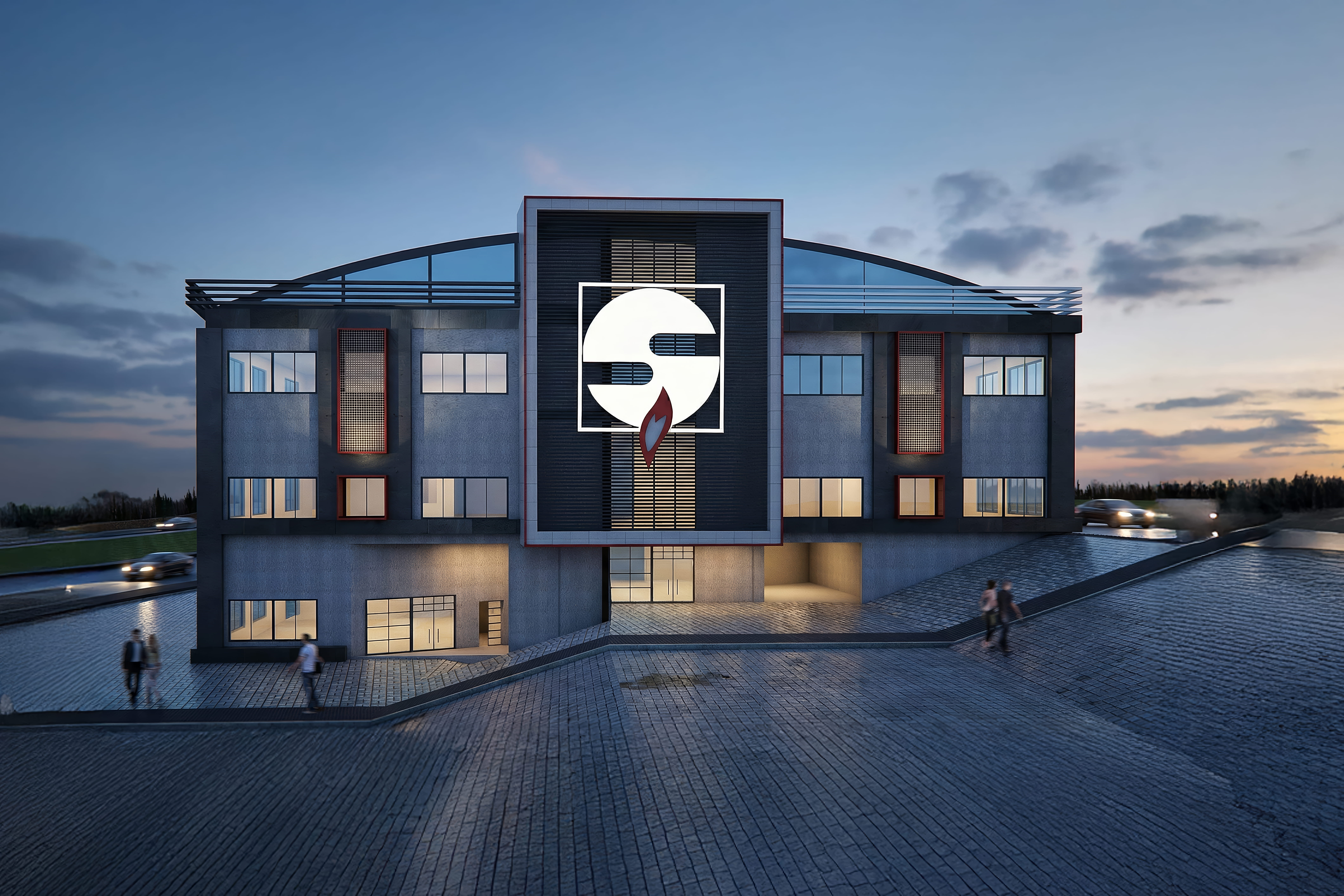 Yapı kütlesi, üretim hacmi ve idari blok olmak üzere iki ana bileşenden oluşmaktadır. İdari birim, cephede vurgulanan düşey cam yüzeyler ile tanımlanmış ve yapı kimliğini oluşturan ana mimari unsur olarak öne çıkarılmıştır. Bu düşey açıklıklar, hem iç mekâna doğal ışık alınmasını sağlamakta hem de cephede ritmik bir düzen oluşturmaktadır. Yapının köşe ve giriş noktalarında oluşturulan kütlesel hareketler, ölçek etkisini güçlendirerek daha dinamik bir mimari ifade sunmaktadır.