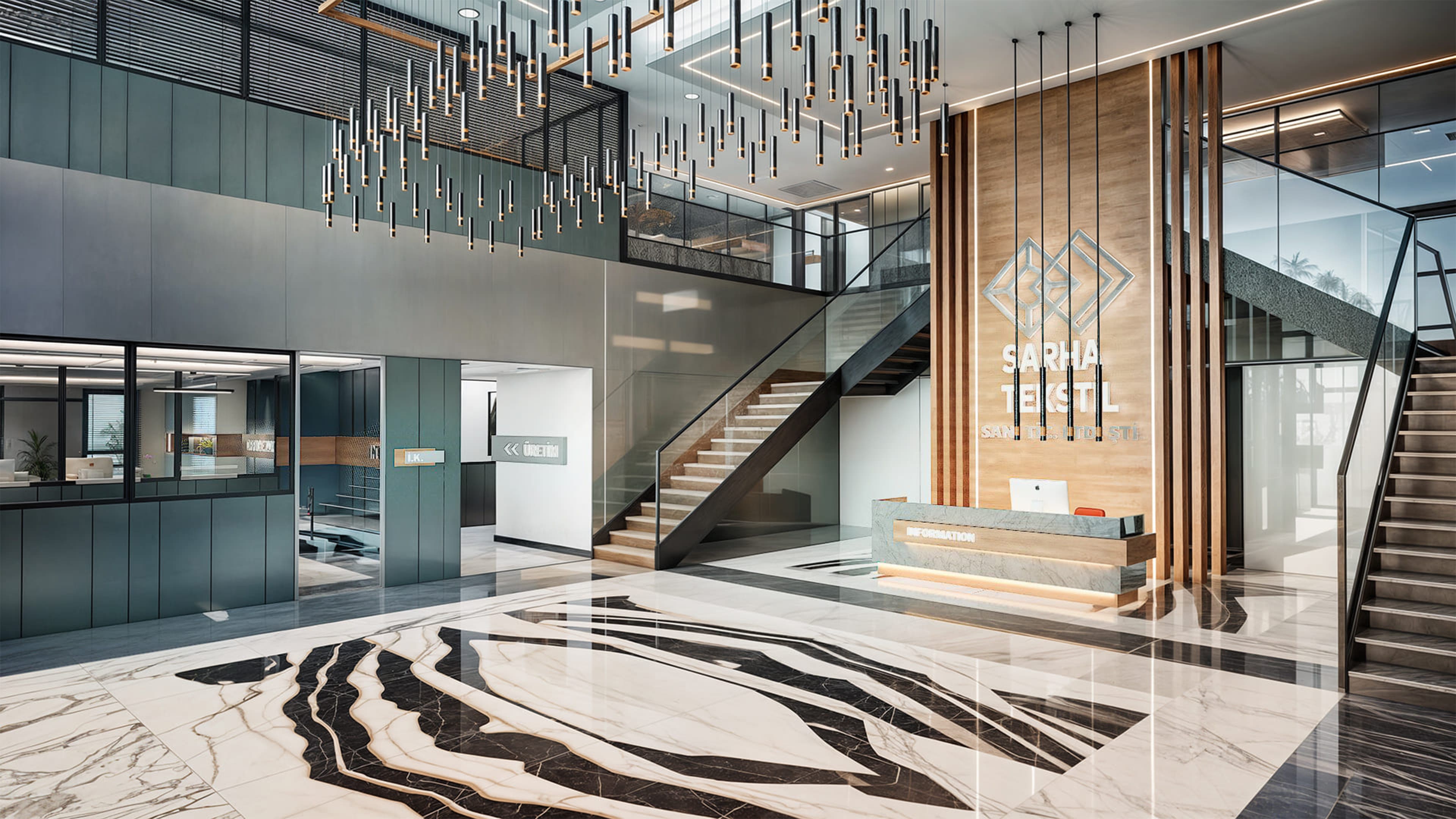 Sarha Tekstil binası, iç mekanları dikkat çekici ve özgün mekân düzenlemeleri ile ‘ikonik’ bir yapı kimliği kazandıracak şekilde tasarlanmıştır. Her bir metrekare, işlevsellik önceliği gözetilerek planlanmış ve aynı zamanda estetik ve tasarım bütünlüğüyle bütünleştirilmiştir.