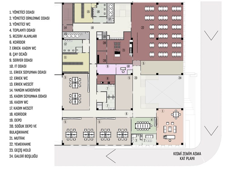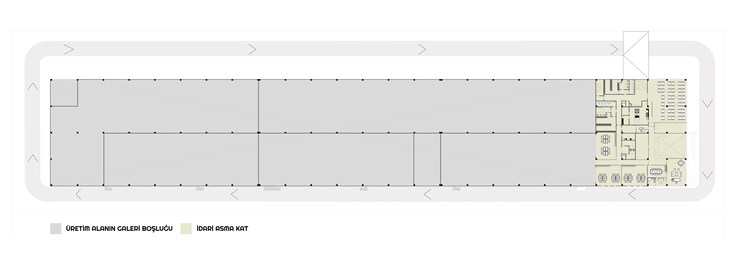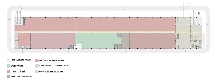 Yapı, 25.070 m × 4.160 m ölçülerinde planlanmış olup, içerisinde zemin kat çok fonksiyonlu bir organizasyona sahiptir; lobi, üretim ve teknik odaları barındırmakta ve toplam brüt alanı 10.529 m²’dir. Zemin asma kat ise idari birimler ve yemekhane ile diğer teknik odalara ayrılmış olup, toplam brüt alanı 1.404 m²’dir.