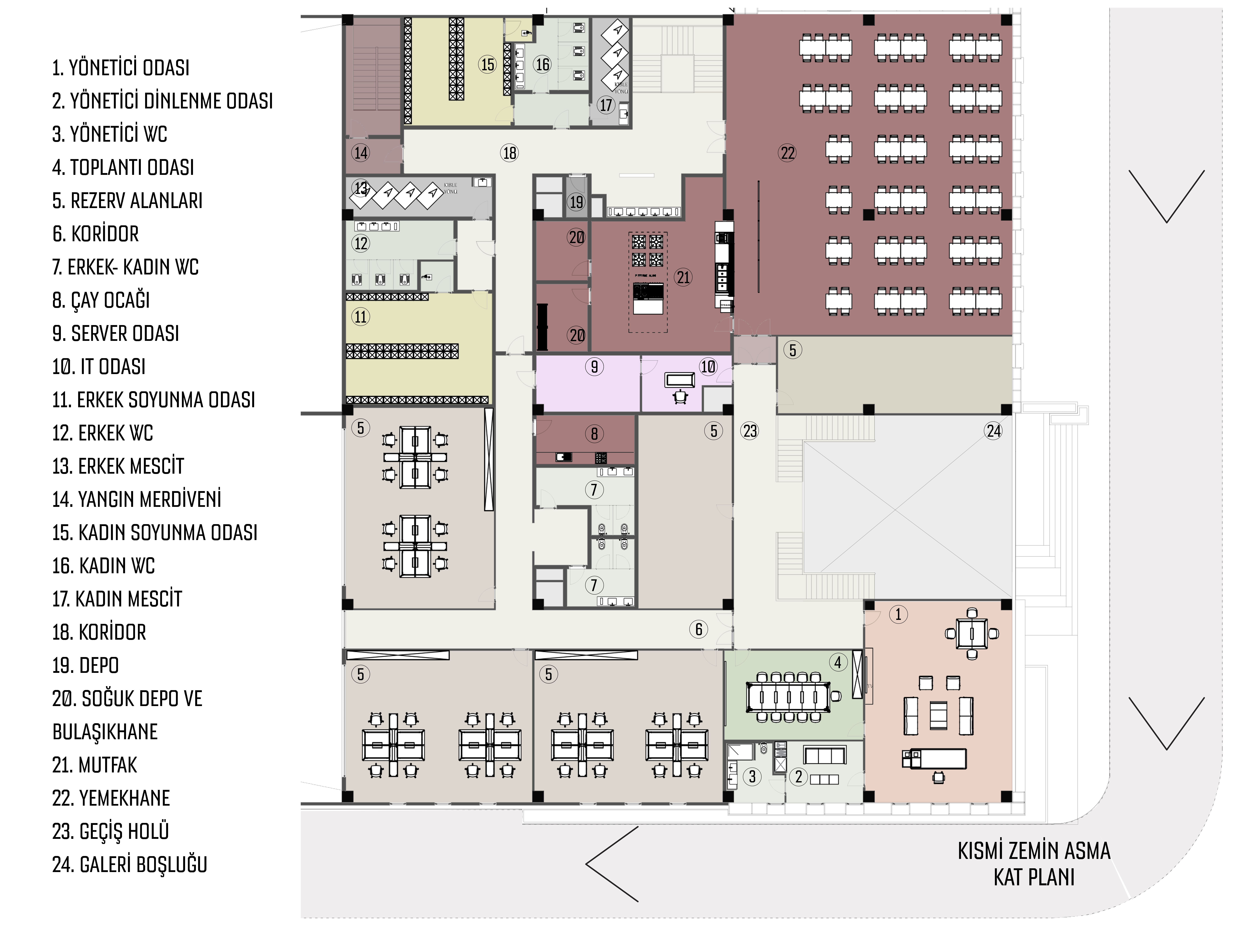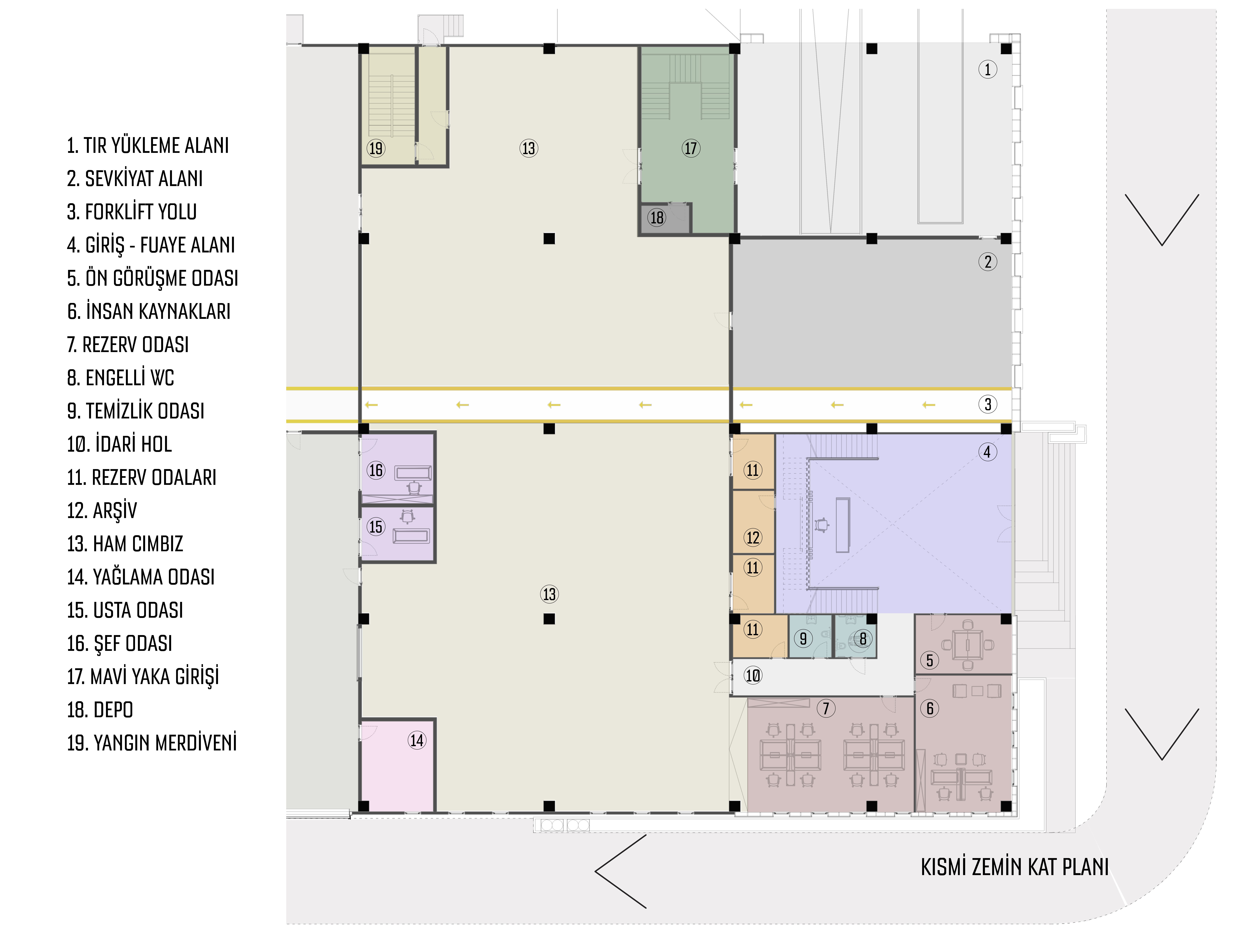 Yapı, dikdörtgen formu ile planlanmış olup, bu tasarım üretim ve işlevsel alanların verimli bir şekilde organizasyonunu mümkün kılmaktadır. Konumlandırmada, kuzey cephesinin kısa kenara gelecek şekilde yerleştirilmesi, yapının soğuk rüzgarlardan minimum düzeyde etkilenmesini sağlayarak iç mekan konforunu artırmak amacıyla stratejik bir tercih olarak benimsenmiştir.