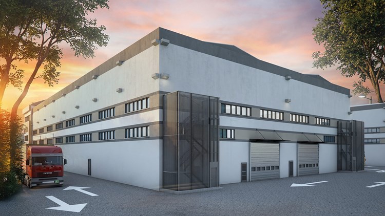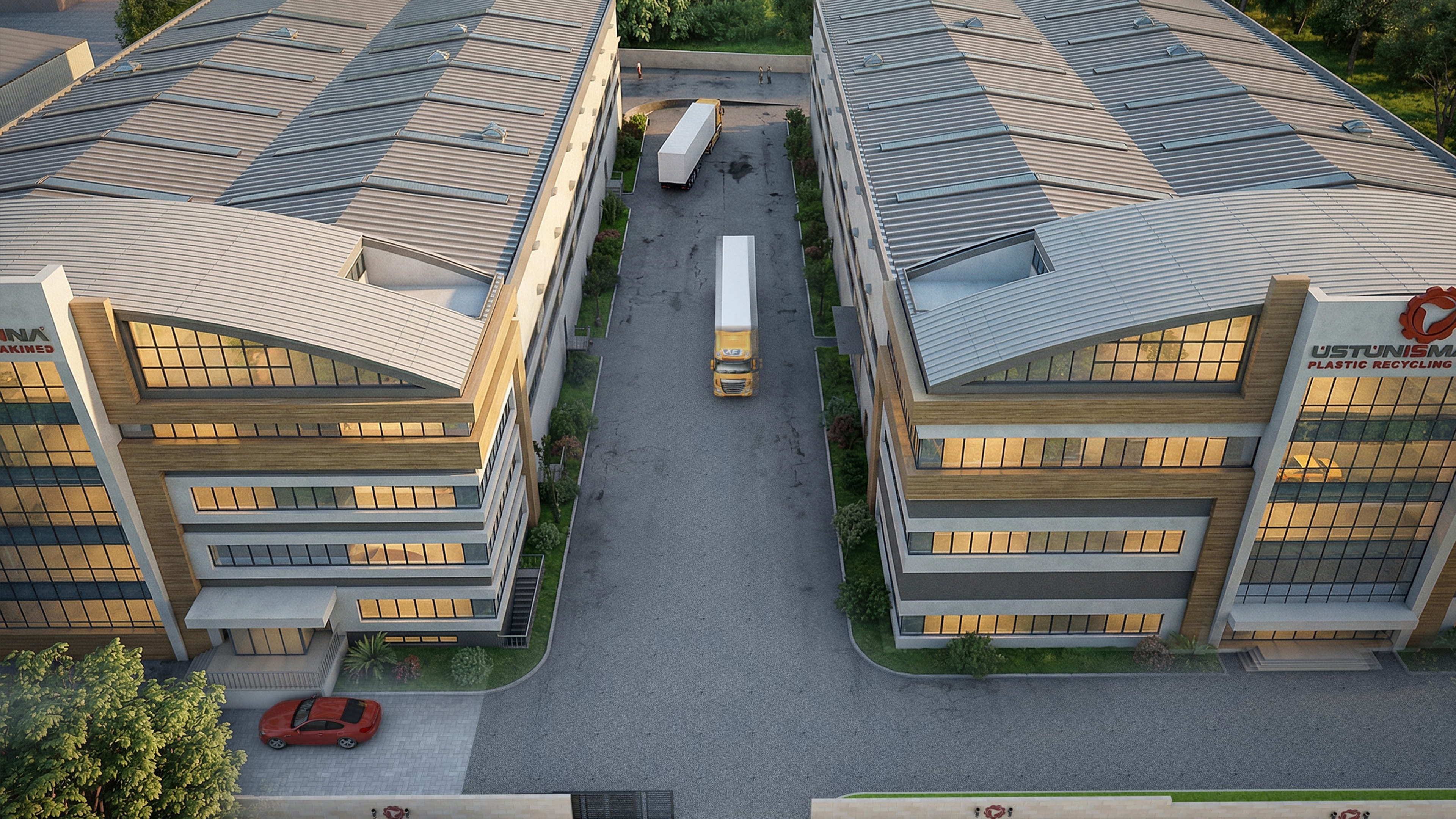 Her iki blok cephesine baktığımızda ana girişi vurgulamak için bina yüksekliği boyunca çerçevelenerek kale sinterflex malzeme ile kaplanmıştır. İdari binalar kompozit panel ile kaplanırken üretim kısmı mantolama üzeri su bazlı boya ile yapılmıştır. Su bazlı boya tüm cepheden farklı bir ral kodlu boya ile doğrama etrafı yatay lineer bir şekilde yapı çevresi boyunca dönülmüştür.