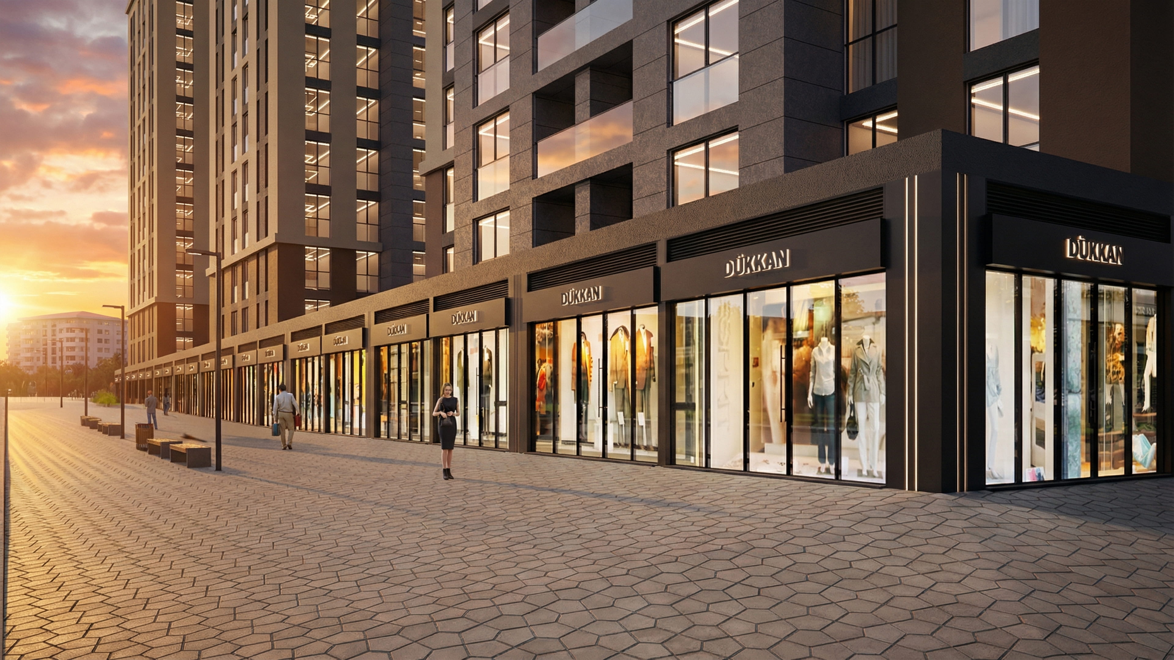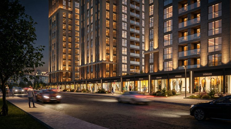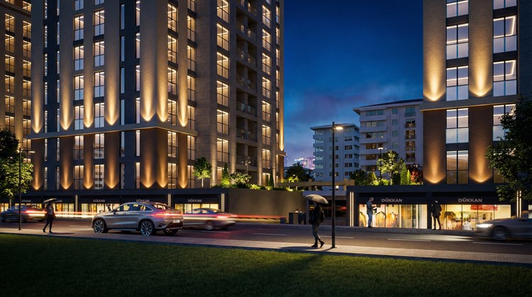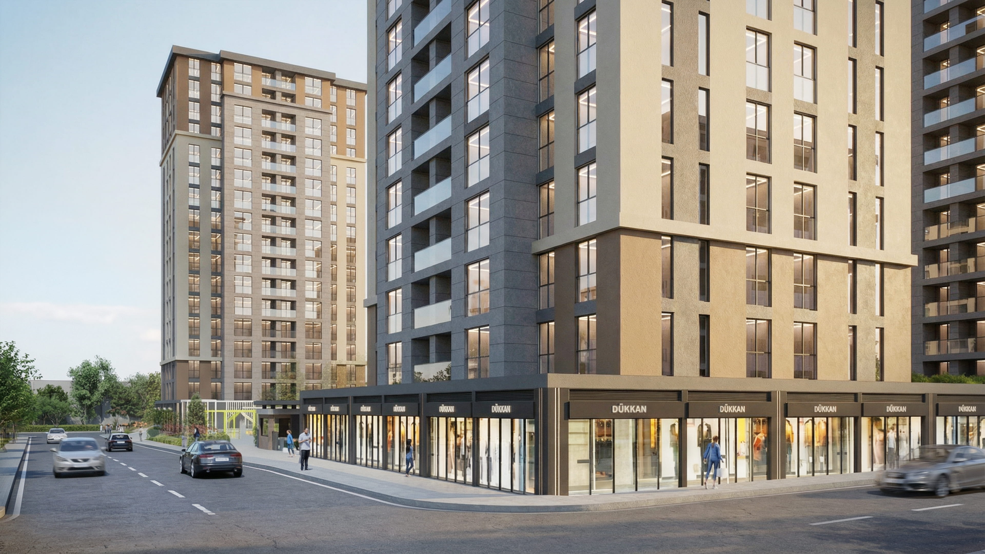 Mimari dilde, zemin kotundan itibaren yükselen kütlelerde yatay ve düşey elemanların dengeli kullanımı ile modern ve güçlü bir cephe karakteri elde edilmiş; doğal tonlardaki kaplama malzemeleri, geniş cam yüzeyler ve ritmik pencere boşlukları ile cephede süreklilik sağlanmıştır. Zemin katlarda ticari birimlerin konumlandırılması ile yapı, yalnızca bir konut alanı olmanın ötesine geçerek kentsel yaşamla doğrudan ilişki kuran yarı kamusal bir arayüz üretmektedir; bu durum proje alanını günün farklı saatlerinde aktif tutarak kentsel canlılığı artırmaktadır.Planlama yaklaşımında, zemin kat ticari fonksiyonlar ve ortak alanlar için ayrılırken, üst katlarda konut birimleri yer almaktadır.